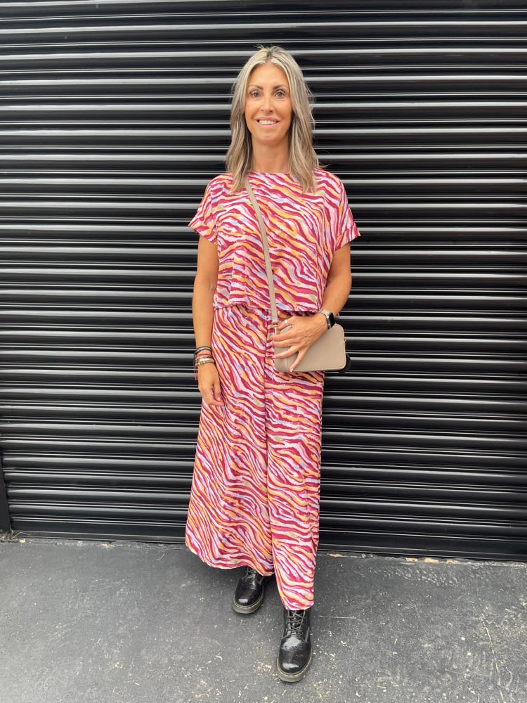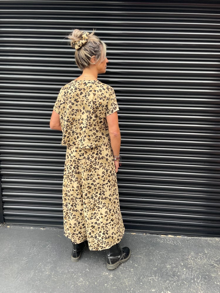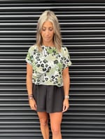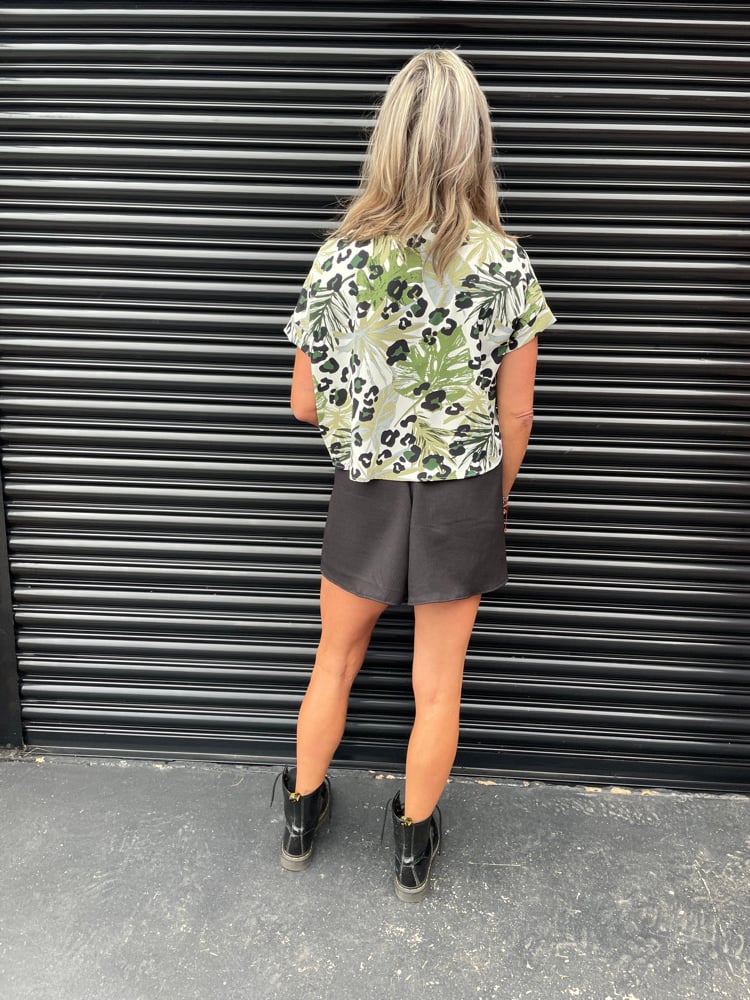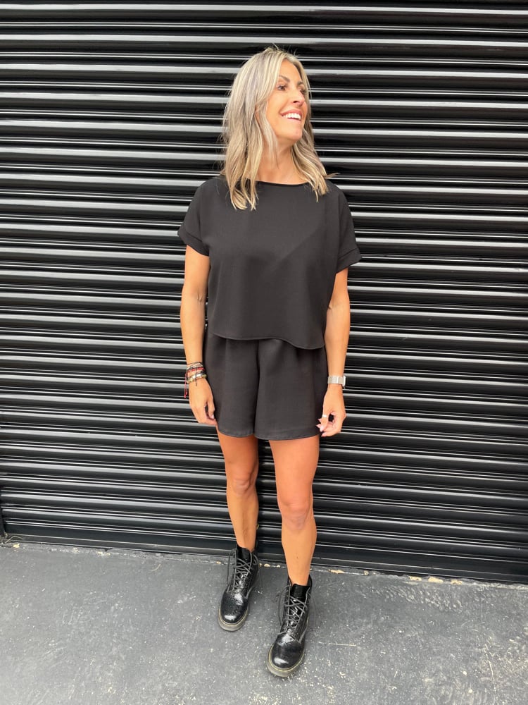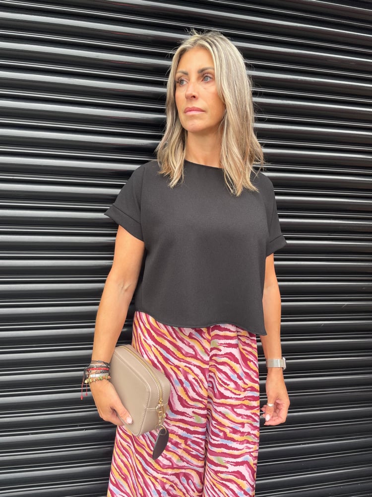 Floaty fancy top, hip length, short sleeve in fabrics such as satin, crepe, linen.